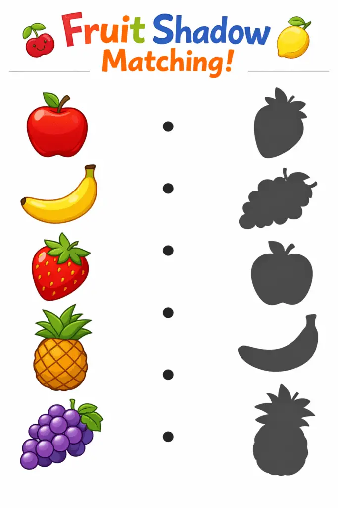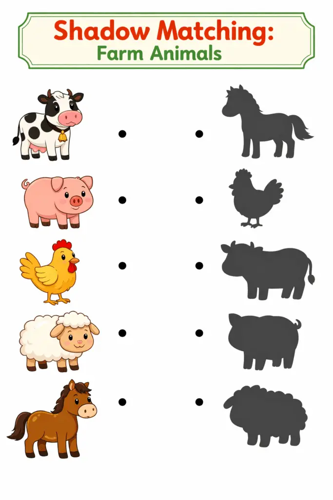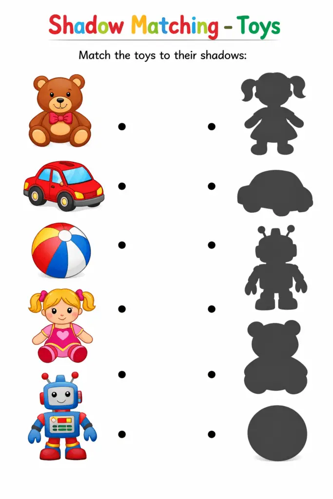 •Simple Matching (Ages 2-3): Print the sheets and have your child draw a line from the colored picture to the correct shadow.