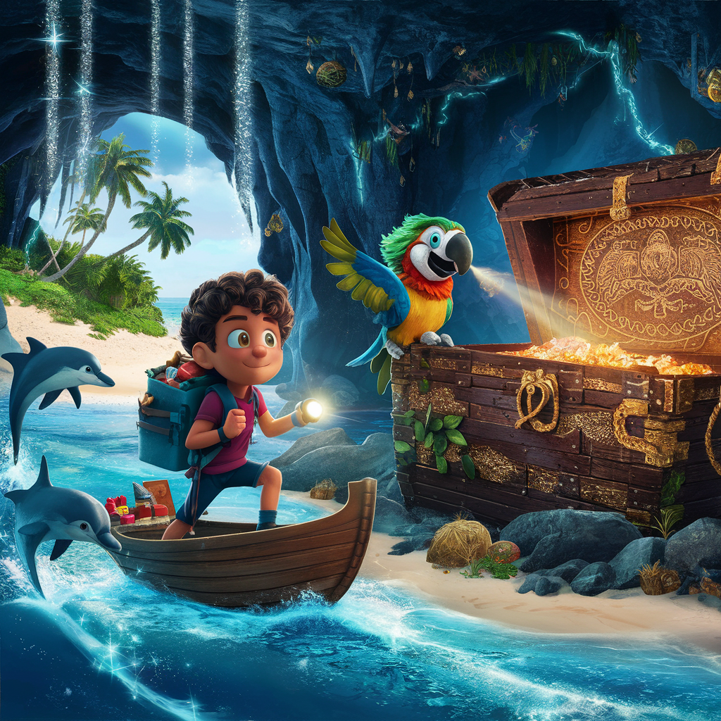 Un garçon nommé Hugo, avec des cheveux bouclés et des yeux curieux, vivait près de la mer. Un soir, il trouva une vieille carte au trésor cachée dans une bouteille échouée sur la plage. Excité, il décida de suivre la carte qui menait à une mystérieuse île des trésors cachés. Il embarqua sur son petit bateau en bois, équipé d’un sac à dos rempli de provisions et d’une lampe torche. Alors qu’il naviguait vers l’île, il rencontra des dauphins qui le guidèrent à travers les eaux scintillantes.