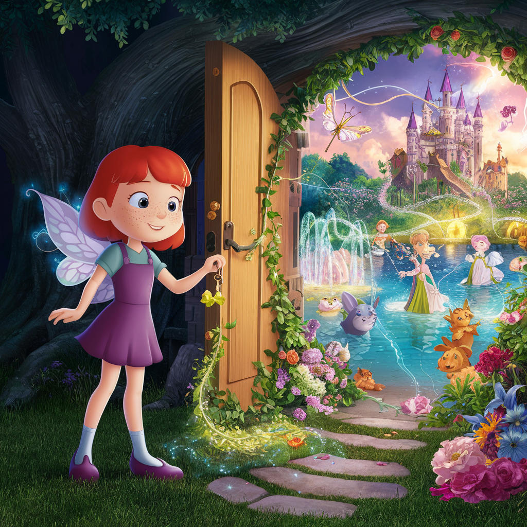 Une petite fille nommée Emma, avec des cheveux roux et des taches de rousseur, vivait dans une maison au bord de la campagne. Un jour, en explorant le jardin derrière sa maison, elle découvrit une vieille clé rouillée. Intriguée, elle chercha la serrure qui correspondait à cette clé. Après avoir fouillé dans les buissons et les arbres, elle trouva une porte cachée derrière un vieux chêne. En tournant la clé dans la serrure, la porte s’ouvrit sur un magnifique jardin secret rempli de fleurs exotiques et de créatures merveilleuses.