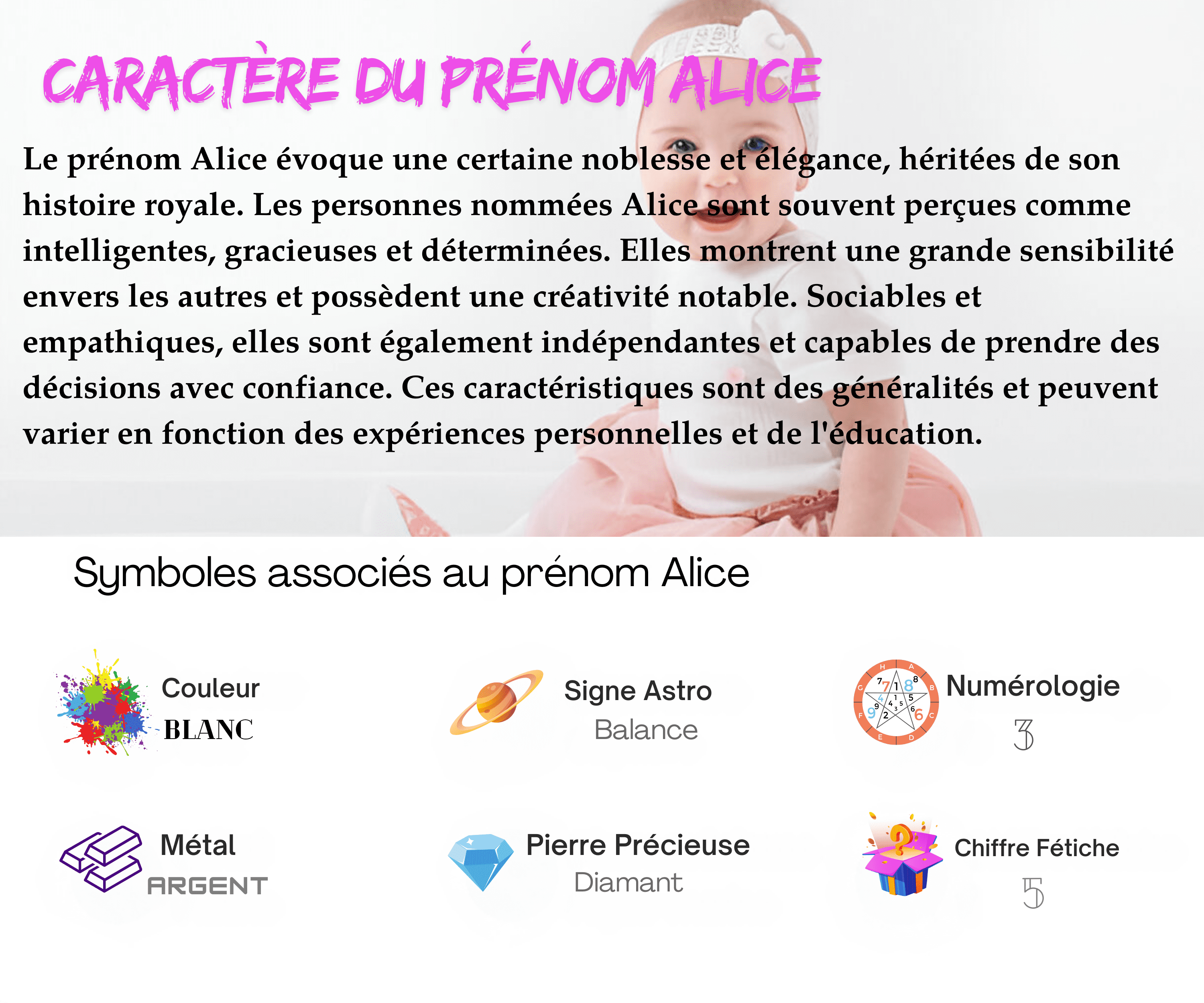Alice est souvent associé à des qualités telles que la noblesse, la pureté et la dignité. Le prénom véhicule une certaine grâce et douceur, héritage de son origine royale et historique. Il est également perçu comme un prénom intemporel, classique et élégant.