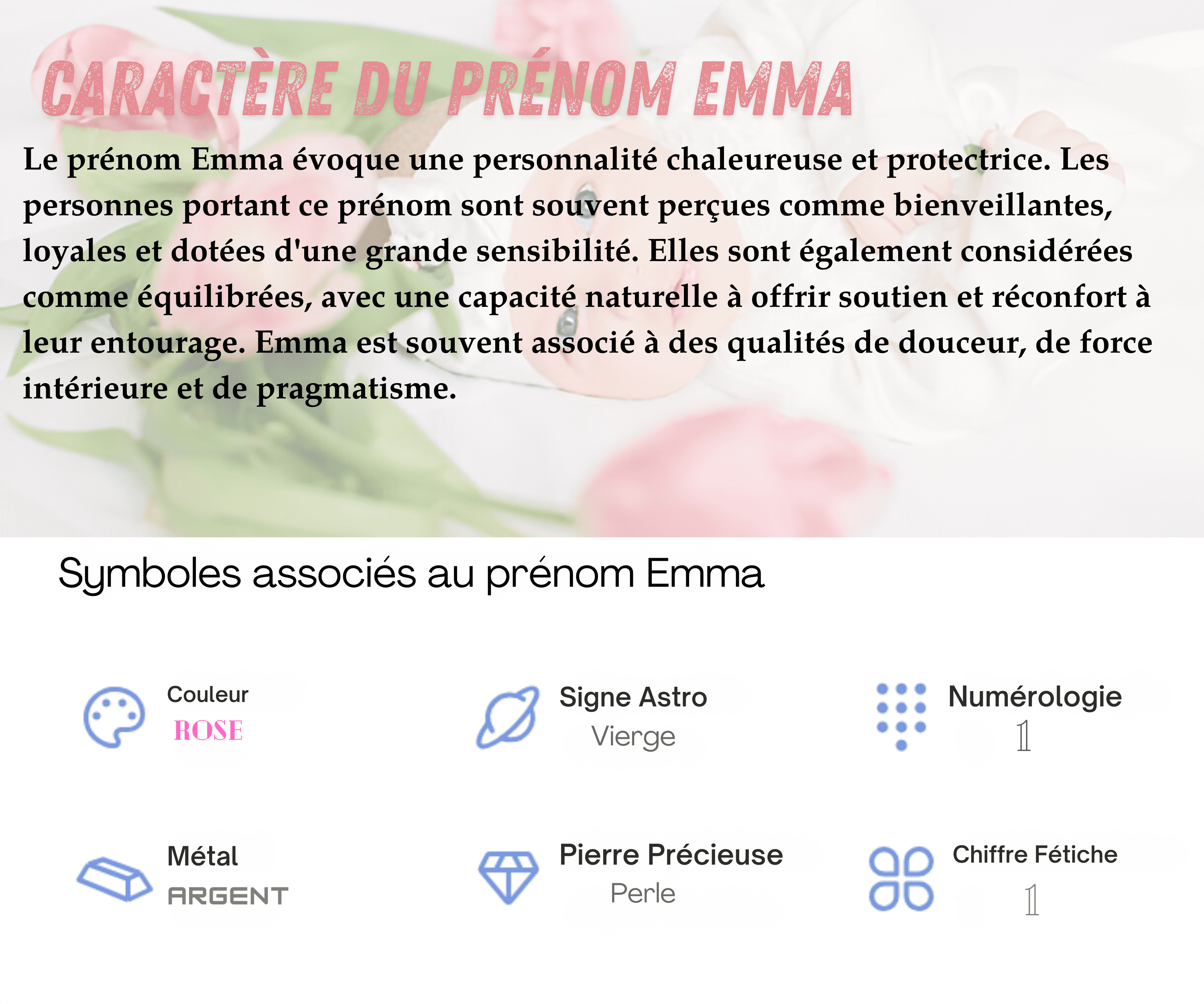 Emma est souvent associé à des qualités de protection, de douceur et de bienveillance. Le prénom véhicule une certaine élégance et simplicité, tout en portant un sens profond de protection et de soutien. Emma est perçu comme un prénom intemporel, classique et chaleureux, qui reflète à la fois la douceur et la force.