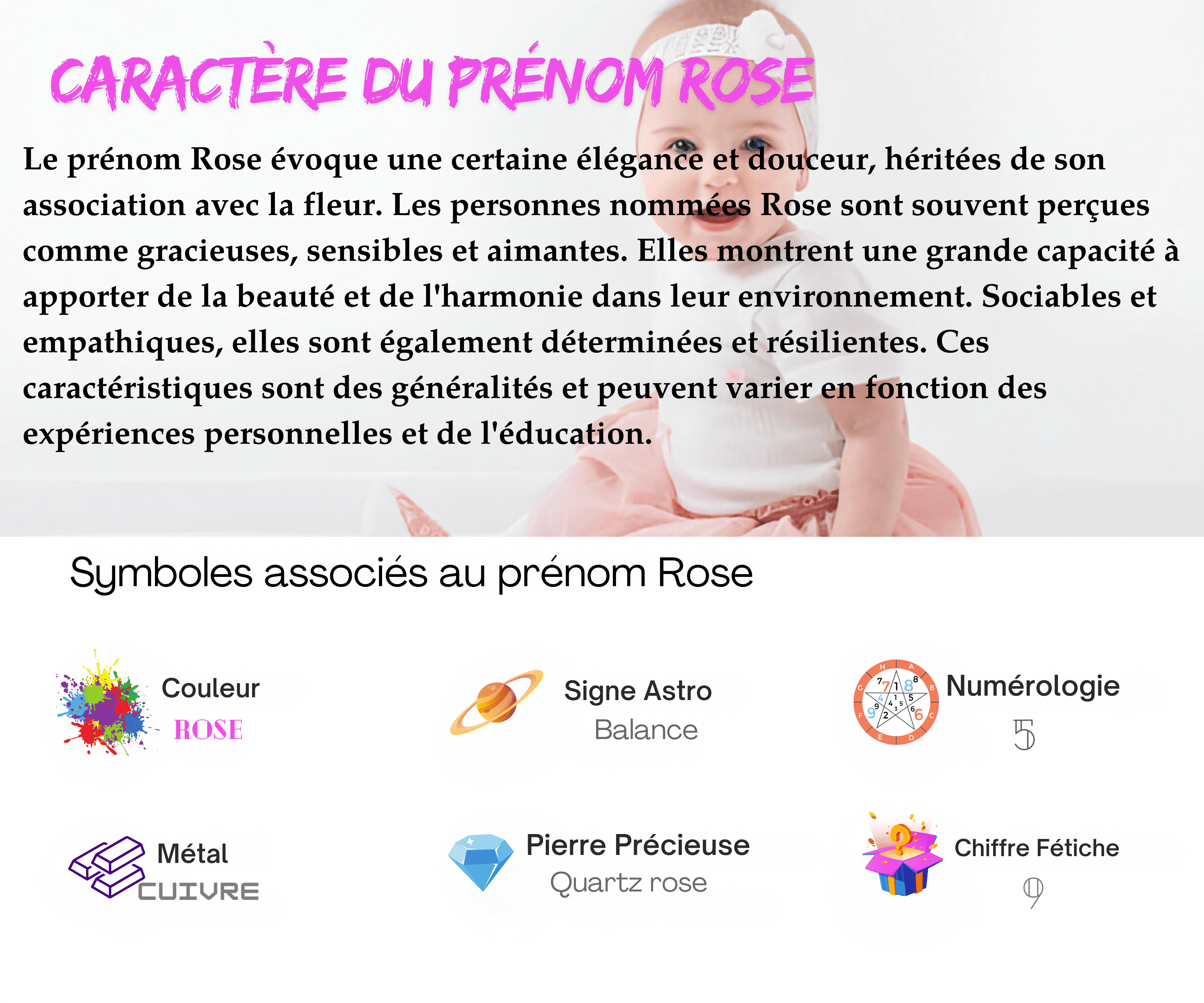 Rose est souvent associé à des qualités telles que la beauté, l’élégance et la grâce. Le prénom véhicule une certaine douceur et délicatesse, héritage de son association avec la fleur. Il est également perçu comme un prénom intemporel, classique et raffiné.