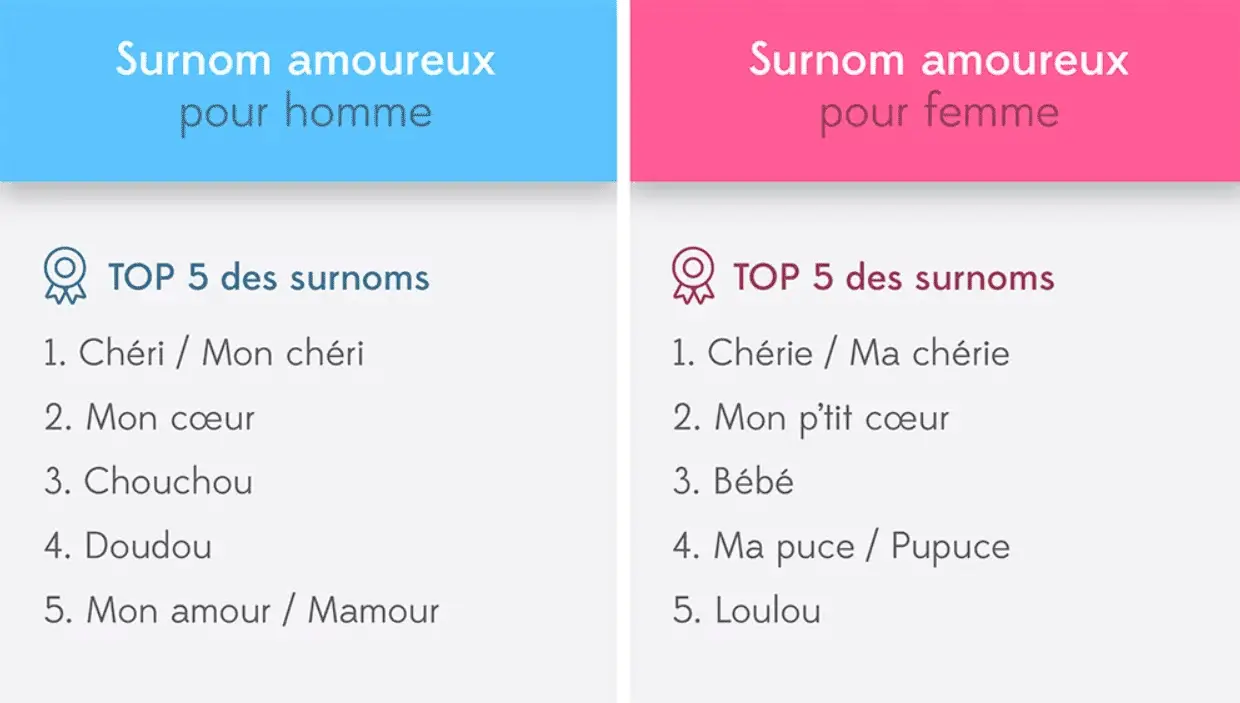 Mon Bichon, Mon Bisounours, Mon Canard, Mon Chamallow, Mon Choubidou, Mon Choupinou, Mon Choux, Mon Doux Frisé, Mon Chounet, Mon Coussinet, Mon Petit Chat, Mon Petit Tigre, Mon P’tit Lutin.