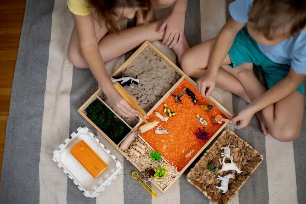 Sensory bins (also known as sensory trays or Montessori trays) are containers designed to stimulate a child’s senses. They are filled with an array of objects, materials, and textures centered around a specific theme or concept. The primary goal is to encourage autonomous sensory exploration, allowing children to use their hands, eyes, nose, and ears to discover their environment.